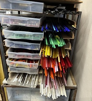 牛小屋をガラス工房、展示室(2F)に改装。ガラスとんぼ玉用バーナー10基、ガラス溶解炉6基